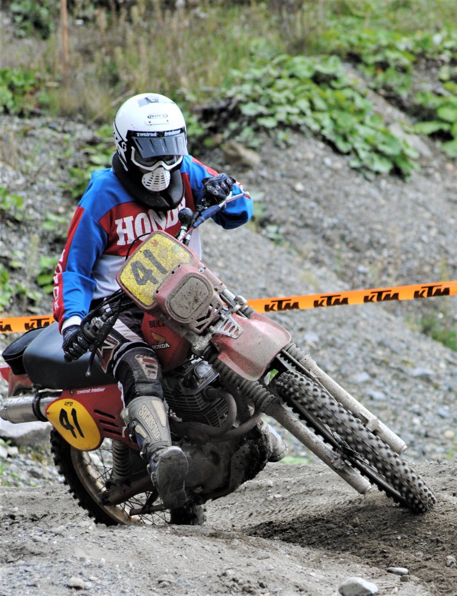 Mit der Einführung von immer schwierigeren Spezialprüfungen begann in den späten 60er-Jahren auch die Entwicklung von Spezialmaschinen für diese Sportart. Zündapp, Hercules, Maico und BMW waren die westdeutschen Hersteller, die sich sehr stark engagierten. Auf den internationalen Strecken trafen sie auf die ostdeutsche Konkurrenz von MZ und Simson, sowie die Profiteams aus Italien und es kam immer zu hochspannenden Duellen um die Klassensiege. Inzwischen hat sich eine aktive Szene für den sportlichen Einsatz von klassischen Enduromotorrädern etabliert. Dort treten auch immer alte Haudegen wie der mehrfache Welt- und Europameister Eddy Hau an. Für den Motorclub Neuburg sind in dieser tollen Oldtimerdisziplin die Trinkners unterwegs. Der Fuhrpark dieses Familienteams kann sich durchaus sehen lassen. Die Buch GS 504 XL (Baujahr 1980 – auf den Bildern mit der Startnummer 41) wurde von Bernd Buch für die große Viertakterklasse der deutschen Enduro-Meisterschaft 1981 aufgebaut und per Einzelabnahme zugelassen. Diese Geländesportrarität bewegt meist Papa Dieter Trinkner. Sie hat einen französischen Barigo-Rahmen und ist mit einen aufgebohrten Motor einer Honda XL 500 ausgestattet. Die Zweitmaschine (auf den Bildern mit der Startnummer 40) hat ebenfalls einen Hondamotor, der in einen englischen Curtis-Rahmen eingebaut wurde. Mit diesem Gerät ist meistens einer der Söhne von Dieter unterwegs.